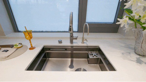 多功能水槽龙头轻松切换用水模式,滨特尔前置过滤器+末端直饮水+中央净软水机,全屋净水呵护家人饮水健康=,还有线形凉霸默默为烹饪者送来清凉。所有展示橱柜皆为交付标准▼▷◆,包括上柜、下柜▼●•、拉篮、随心抽,以及特别定制的飘窗水槽与水槽柜——每一处细节,都为真实的生活而考虑。